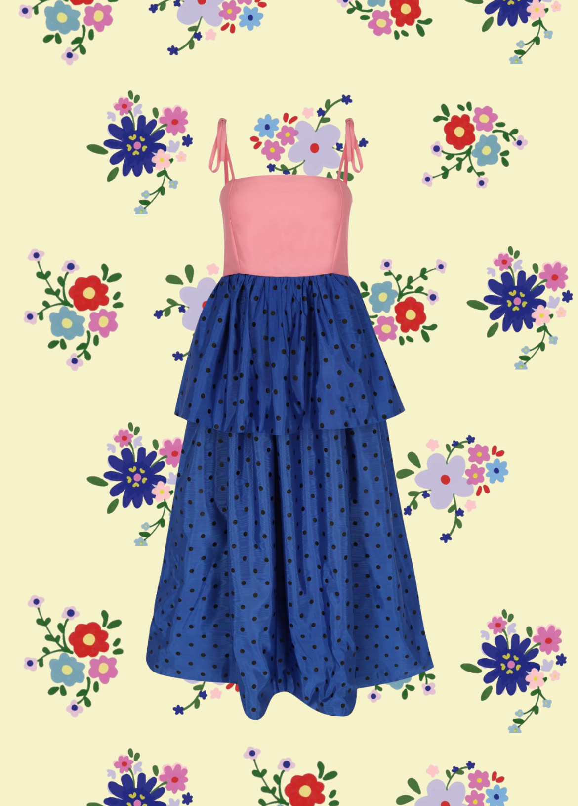 Vestido de tafeta color rosa y azul rey con polka dots negros. Largo midi a tobillos, este vestido es una pieza de colección con sólo 10 piezas en existencia.